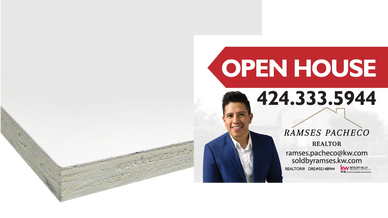 1/2" Thick Wood. Heavy duty, medium density overlay, specialty treated to survive the rain, snow and heat. Direct to print with UV inks, comes with two holes on top.